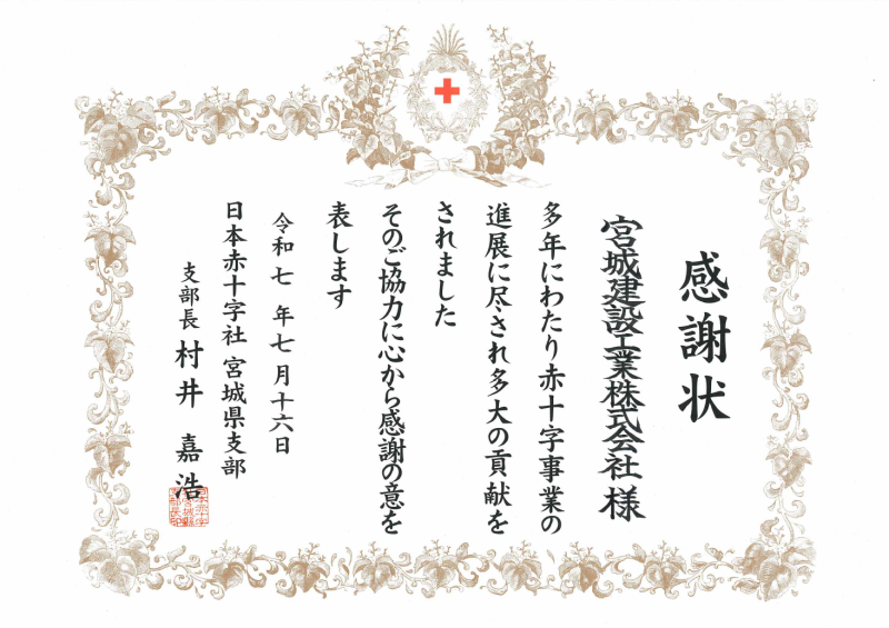 【CSR】日本赤十字社 宮城県支部より感謝状をいただきました 日本赤十字社 宮城県支部より感謝状をいただきました。 弊社では毎年5月の安全大会にあわせて富谷支店に献血バスをお招きし、社員や近隣住民の皆さまに献血に参加いただいております。 本取り組みが、地域医療を支える活動の一助となっていることを大変嬉しく思います。 ご協力いただいた皆さまに心より感謝いたします。 これからも社会に必要とされる企業として、継続的に社会貢献活動に取り組んでまいります。 更新日付:2026.02.25